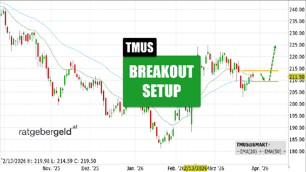 Die T-Mobile US Inc. ist Marktführer im US-Mobilfunk und wächst weiter stark, gestützt durch Kundenzuwächse und den Ausbau des 5G-Netzes; das Unternehmen profitiert von Synergien aus der Sprint-Übernahme und steigert kontinuierlich Umsatz und Gewinn, wobei Analysten weiteres Potenzial sehen, auch wenn der Wettbewerb mit Verizon Communications und AT&T intensiv bleibt; die Aktie wird als attraktiv bewertet, da solide Cashflows, steigende Margen und mögliche Aktienrückkäufe bzw. Dividendenfantasie für langfristige Anleger sprechen, während Risiken vor allem in regulatorischen Eingriffen und Preisdruck liegen. Charttechnisch sehen wir Chance für weitere Kursanstiege, sofern der Gessamtmarkt Rückenwind liefert.