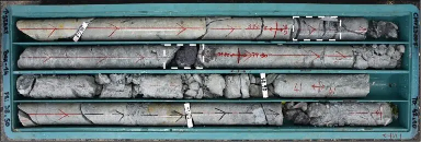 Abb. 2: Bohrkern mit einem HQ3-Durchmesser vom Bohrloch CMV23007, der silifizierten Lapilli-Tuffstein mit Sulfidäderchen und halbmassive Sulfidintervalle zeigt, die Stibnit, Sphalerit und Quartz einschließen (siehe weiß-gestrichelte Rechtecke).