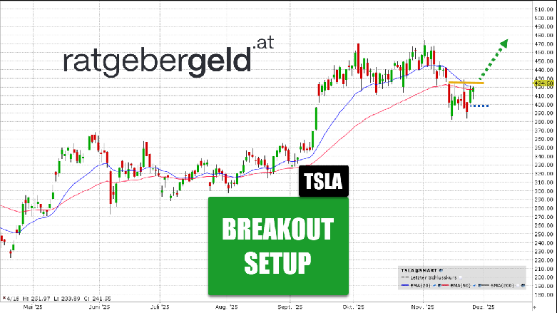Es gibt Berichte über einen deutlichen Absatzrückgang in Schlüsselmärkten wie Europa, teilweise zurückzuführen auf verschärften Wettbewerb und die Drosselung staatlicher Förderungen. Wie in der Vergangenheit liegt die „Fantasieprämie“ der Aktie stark auf zukünftigen Projekten wie dem autonomen Fahren (Full Self-Driving, FSD) und Robotaxis (Cybercab). Der Chart zeigt die Tesla-Aktie in einer technisch spannenden Situation. Nach einer Korrektur konsolidiert der Kurs nun unterhalb eines kurzfristigen Widerstands. Ein erfolgreicher Ausbruch über dieses Niveau würde ein starkes Signal für eine Fortsetzung der Aufwärtsbewegung im übergeordneten Trend liefern.