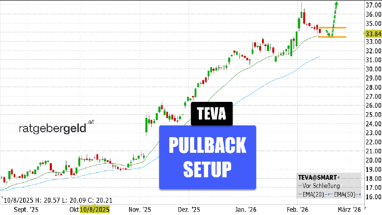 Rückblick: Mit +88 Prozent in den letzten sechs Monaten verzeichnet die Teva-Aktie einen ordentlichen Kursanstieg. Nach dem Pivot-Hoch vom 3. Februar gab es eine Bullenflagge mit sieben roten Tageskerzen zum 20er-EMA.