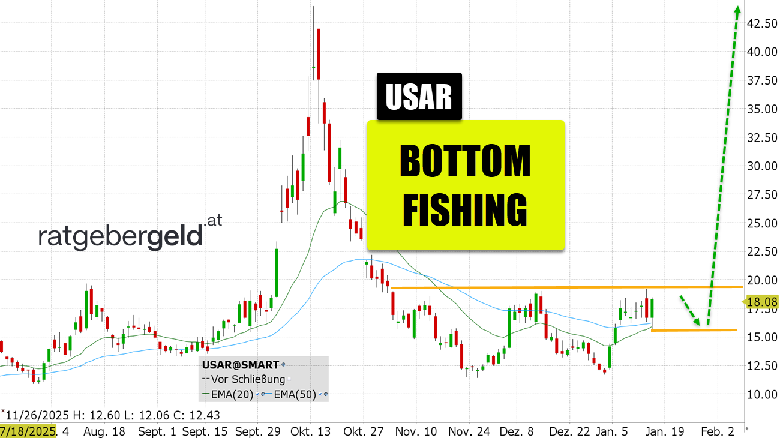 Rückblick: Nach der Kursrallye des vergangenen Herbstes zum Allzeithoch am 13. Oktober ist die USAR-Aktie auf die Kursrange vor dem Ausbruch zurückgekehrt. Das aktuelle Bottomfisching-Setup formiert sich aus dem leicht höheren Tief vom Jahresschluss und der Widerstandslinie knapp über 19 USD.