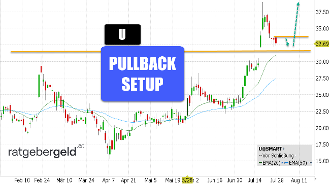 Rote Zahlen ohne Ende, aber …!Kommt endlich der Turnaround bei Unity Software (U)? Pullback-Setup im Gaming-Sektor! Einstieg noch vor den Quartalszahlen?