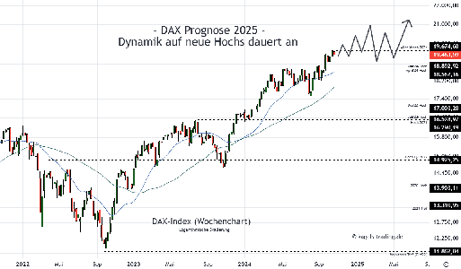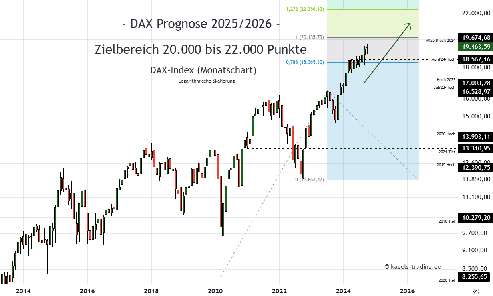 - Mittelfristige DAX Prognose 2025-2026: Im Anlauf über die runde Marke bei 19.000 Punkten hat der deutsche Leitindex ein nächstes Allzeithoch markiert und lässt nach Abschluss eines Pullbacks noch weitere Rekordwerte in Richtung der 21.000er-Marke erwarten.