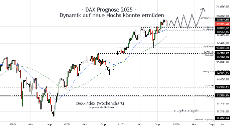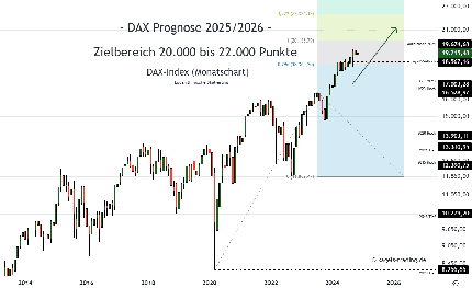 - Mittelfristige DAX Prognose 2025-2026: Im Anlauf über die runde Marke bei 19.000 Punkten hat der deutsche Leitindex ein nächstes Allzeithoch markiert und lässt nach Abschluss eines Pullbacks noch weitere Rekordwerte in Richtung der 21.000er-Marke erwarten.
