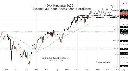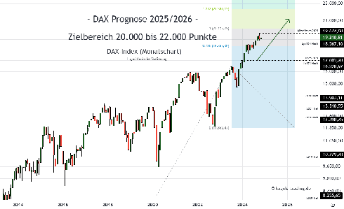 - Mittelfristige DAX Prognose 2025-2026: Im Anlauf über die runde Marke bei 19.000 Punkten hat der deutsche Leitindex ein nächstes Allzeithoch markiert und lässt nach Abschluss eines Pullbacks noch weitere Rekordwerte in Richtung der 21.000er-Marke erwarten.