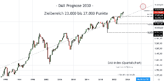 Zur Jahresmitte 2030 könnte sich der DAX in einem Zielbereich zwischen 23.000 und 27.000 Zählern befinden.