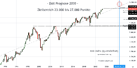 Zur Jahresmitte 2030 könnte sich der DAX in einem Zielbereich zwischen 23.000 und 27.000 Zählern befinden.