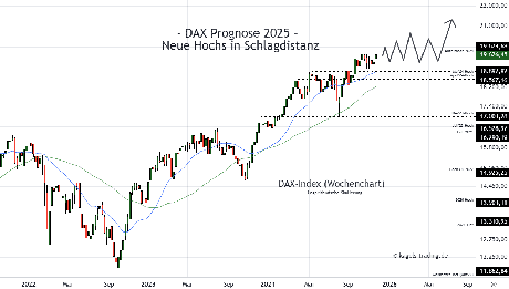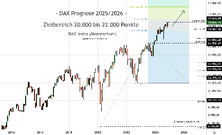 - Mittelfristige DAX Prognose 2025-2026: Im Anlauf über die runde Marke bei 19.000 Punkten hat der deutsche Leitindex ein nächstes Allzeithoch markiert und lässt nach Abschluss eines Pullbacks noch weitere Rekordwerte in Richtung der 21.000er-Marke erwarten.