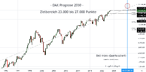 Zur Jahresmitte 2030 könnte sich der DAX in einem Zielbereich zwischen 23.000 und 27.000 Zählern befinden.