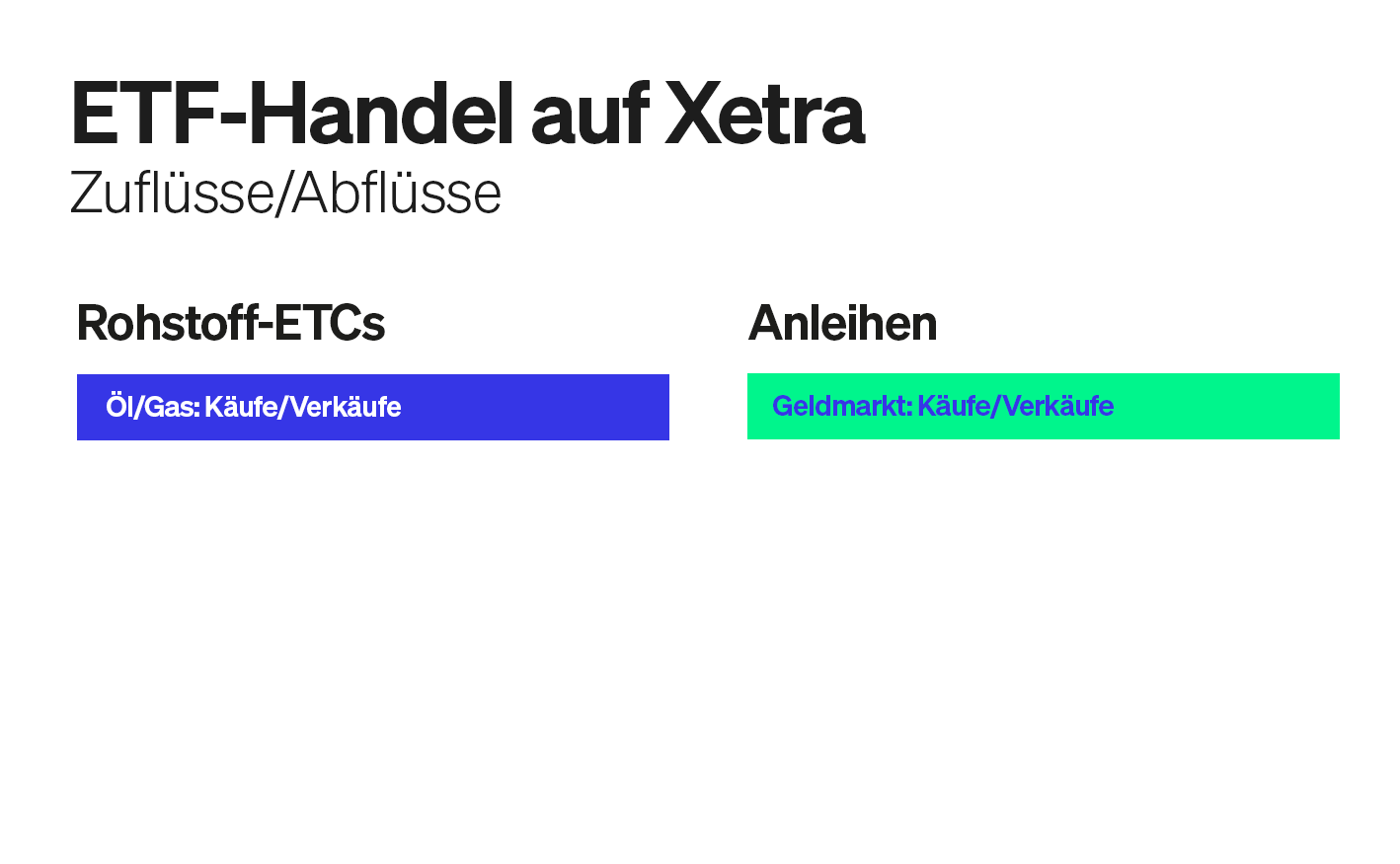 Auch in Öl- und Gas-ETFs geht viel um. Hier werden Mohr zufolge beide Seiten gespielt, mit einem leichten Verkaufsüberhang. Gesetzt werde etwa auf den iShares MSCI World Energy Sector (IE00BJ5JP105), abgestoßen der iShares Stoxx Europe 600 Oil & Gas (DE000A0H08M3).