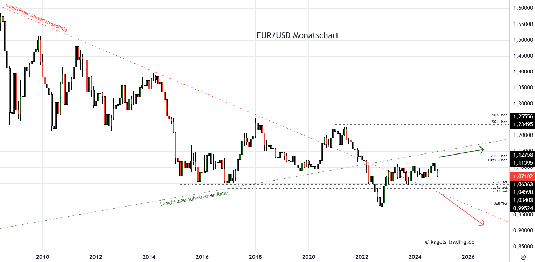 Mittelfristige Euro Dollar Prognose anhand des Monatscharts: Der Bruch am Kreuz der Trendlinien bei circa 1,1150 hat ein stark negatives Signal generiert. Die Erholung ist an der langfristigen Aufwärtstrendlinie zunächst auf Widerstand gestoßen, so dass im weiteren Verlauf bis 2025 eine Schiebephase über 1,06 möglich bleibt.