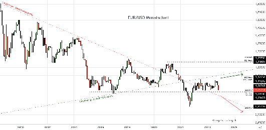 Die Jahreskerze 2020 zeigt eine deutliche Erholung vom Tief und konnte im Schlusskurs das 2015er Hoch von 1,2107 überbieten. Im Jahr 2021 wurden diese Kursgewinne größtenteils wieder abgegeben und der EURUSD hat bei 1,1366 geschlossen. Das Jahr 2022 ist schwach gestartet, unter die langfristige Unterstützungslinie gebrochen und hat auch die Parität im Jahrestief bei 0,9535 deutlich getestet. Am Ende konnte sich der Kurs zurück an die 1,07 retten. Das Jahr 2023 ist weniger volatil verlaufen, deutet im Hoch jedoch Widerstand an der gebrochenen Unterstützungslinie an.