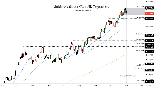 Ergänzend zum Stundenchart korrigiert der Kurs vom Allzeithoch, womit der Fokus auf der nahen stützenden Zone im Bereich von $2.700 liegt. Der gleitende 20-Tage-Durchschnitt könnte einen korrigierenden Angebotsüberhang noch im Bereich des Septemberhochs abfangen. Während der erhöhten Volatilität durch die US-Wahl können sich auch stärkere Ausschläge ergeben, in denen die Erwartungen an das Wahlergebnis eingepreist werden.