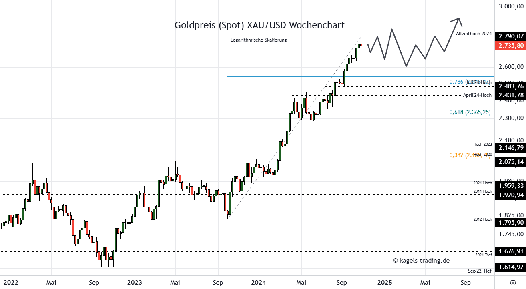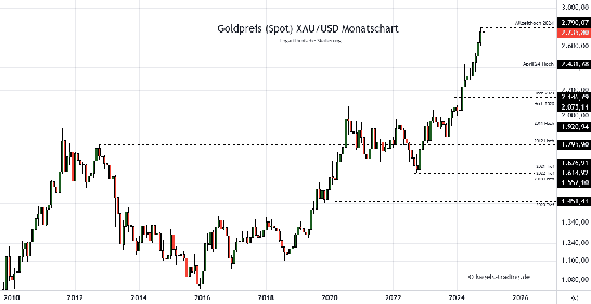 Vom Hoch aus 2020 ist der Goldpreis in eine Korrektur übergegangen, die zunächst eine breite Seitwärtsphase ausgebildet hat. Das Jahr 2022 hat im November ein Tief bei $1.614 markiert, woraufhin bis zum Jahresende noch eine Erholung über $1.800 einsetzen konnte. Im Jahr 2023 wurde diese Dynamik fortgeführt, nach einem Zwischentief bei $1.804 zeigt sich bis ins Jahr 2024 nun eine starke Aufwärtsbewegung mit einem neuen Allzeithoch bei $2.790, wobei die Monatskerzen starke Nachfrage indizieren.