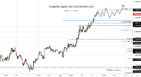 Goldpreis Prognose anhand des mittelfristigen Wochencharts: Nach dem Vorjahreshoch ($2.146) konnte der Kurs Verluste unter die $2.000er Marke abwehren und im Anschluss eine Serie neuer Allzeithochs erreichen, nach einem Rekordwert bei $2.790 könnte zunächst der Korrekturbedarf überwiegen.