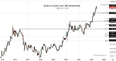 Vom Hoch aus 2020 ist der Goldpreis in eine Korrektur übergegangen, die zunächst eine breite Seitwärtsphase ausgebildet hat. Das Jahr 2022 hat im November ein Tief bei $1.614 markiert, woraufhin bis zum Jahresende noch eine Erholung über $1.800 einsetzen konnte. Im Jahr 2023 wurde diese Dynamik fortgeführt, nach einem Zwischentief bei $1.804 zeigt sich bis ins Jahr 2024 nun eine starke Aufwärtsbewegung mit einem neuen Allzeithoch bei $2.790, wobei die vorangegangenen Monatskerzen starke Nachfrage indizieren.