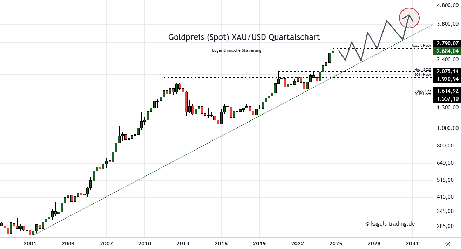 Langfristige Goldpreis Prognose für 2030 anhand des Quartalscharts: Im abgebildeten Quartalschart sehen wir, ausgehend vom Tief des Jahres 2001, einen etablierten, langfristigen Aufwärtstrend. Im dritten Quartal 2022 hat sich der Kurs an der Aufwärtstrendlinie (grün) gestützt und für das vierte Quartal eine Erholung gestartet. Der Goldpreis konnte diese Bewegung im vergangenen Jahr 2023 fortsetzen und im vierten Quartal das Jahreshoch bei $2.146 markieren. Die folgenden Kerzen des Jahres 2024 zeigen mit ihren neuen Rekordwerten ein trendbestätigendes Ausbruchsszenario.