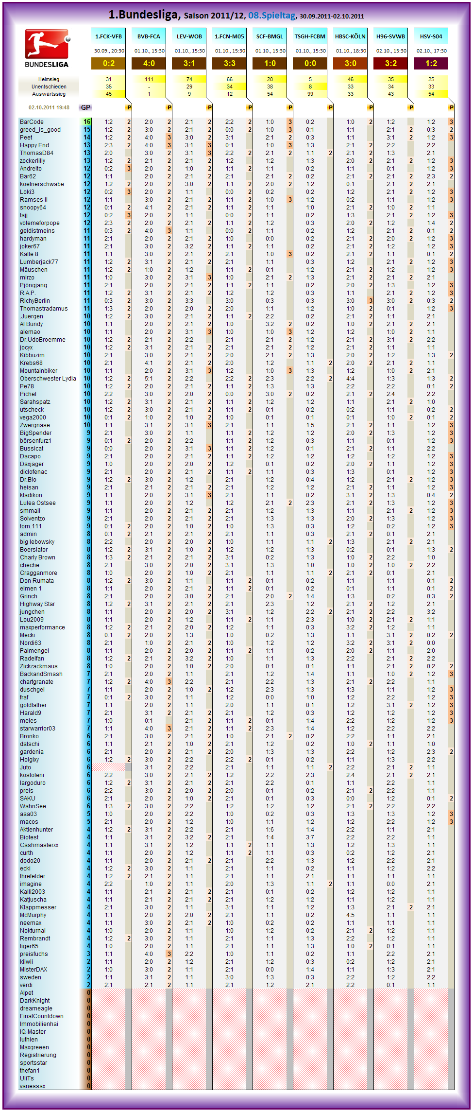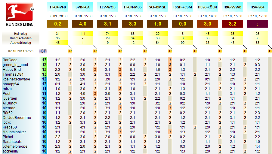Guck de Richy an, trifft auch noch als Einzigster perfekt und heimst n Dreier ein.. jocyx, .Juergen und zockerlilly je zwei Punkte.. Un Du hast den Kopf wg letzten Spiel in Sand stecken wollen und hast noch so n bissl im Frust bestimmt auf Sieg Köln getippt..