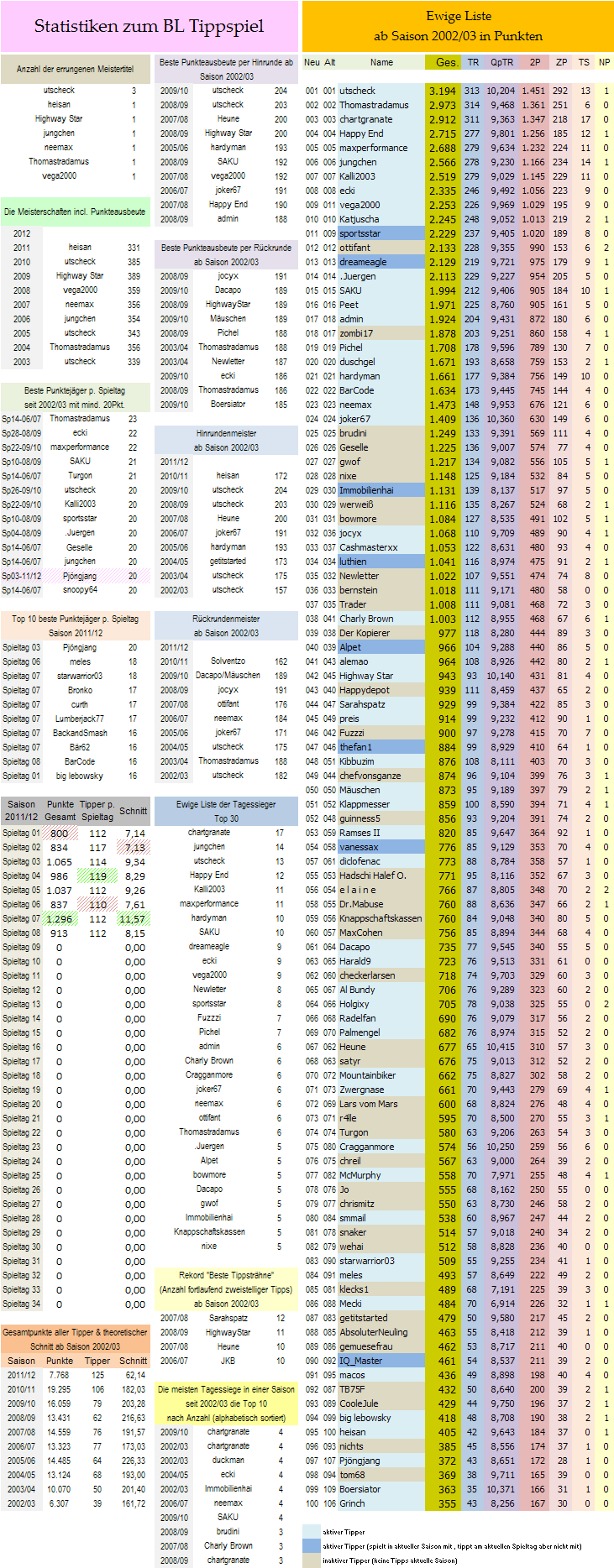 Grinch oist übrigens in die Ewige Top 100 vorgestoßen und belegt eben nun den 100. Platz dort! In selbiger Liste hat es Charly Brown geschafft an diesem 8. Spieltag der Saison 2011/12 insgesamt die 1.000 Punkte Marke zu durchbrechen.. Momentan ist er auf Platz 38 in der Ewigen Liste..