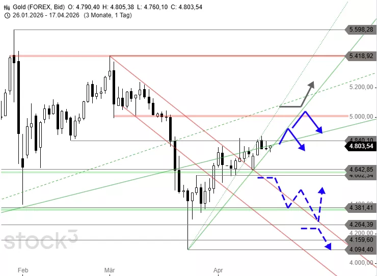 Nach dem Anstieg über ihr Zwischenhoch bei 4.602 USD setzte sich die Ende März bei 4.094 USD gestartete Konterbewegung beim Goldpreis fort und erreichte direkt die übergeordnete Abwärtstrendlinie. Diese wurde Anfang April überwunden und damit der erste Angriff auf die zentrale Kurshürde bei 4.840 USD eingeleitet. Seither schlängelt sich der Goldpreis in einer schmalen Range entlang einer früheren Aufwärtstrendlinie seitwärts und versuchte bereits mehrfach, den Widerstand bei 4.840 USD zu durchbrechen und so ein starkes Kaufsignal zu bilden. Aktuell nähert er sich der Marke ein weiteres Mal.