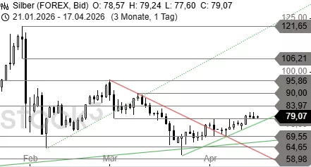 Silber vollzieht einen Pullback an die gebrochene Hürde bei 77,88 USD und könnte von der neuen Unterstützung direkt wieder den Weg nach Norden in Richtung 83,97 USD einschlagen. Kurse unter 76,50 USD würden dagegen für eine Korrekturausweitung sprechen.