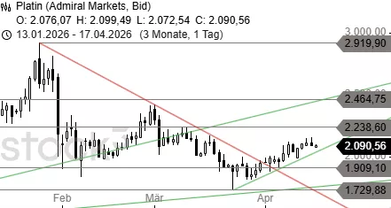 Platin tendiert nach dem Ausbruch über die Hürde bei 2.075 USD seitwärts und bereitet damit den Anstieg auf den großen Widerstand bei 2.238 USD vor. Eine Zwischenkorrektur bis 1.998 USD dürfte die Bullen zuvor nicht aus der Bahn werfen.