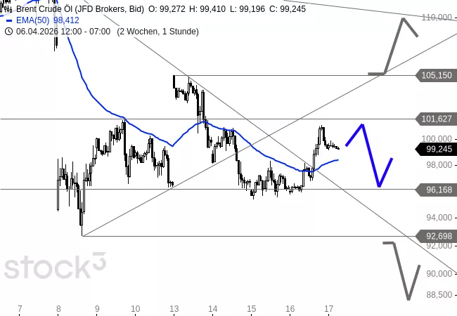 Die Seitwärtsbewegung der vergangenen Handelstage könnte sich fortsetzen. Gelingt ein Anstieg über 101,63 USD, könnten auch die 105,15 USD wieder erreicht werden. Erst darüber würden sich neue prozyklische Kaufsignale ergeben. Auf der Unterseite bleibt ein Rücklauf bis 96,17 USD jederzeit möglich. Abgaben unter 95,40 USD dürften hingegen eine Bewegung bis 92,70 USD beschleunigen, wo sich erneut Chancen auf eine Gegenbewegung ergeben könnten.