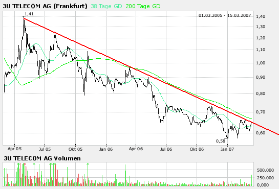 3U Telecom AG: (News/Kurs/Chart/Board) Die Aktie bewegte sich vom März 2005 bis Ende Oktober 2006 in einem langfristigen Abwärtstrend. Nach dem Trendbruch sind zwar neue Verlaufstiefs innerhalb des langfristigen Abwärtstrends erreicht worden, die Trendlinie erwies sich im Dezember 2006 jedoch als signifikante Unterstützung und die Aktie konnte darufhin den wichtigen Widerstand bei 0,66 Euro überwinden. Aktuell bewegt sich die Aktie erneut auf Höhe dieser horizontalen Linie und diese dient nun als Unterstützung. Die mittelfristige Indikatorenlage hellt sich allerding auf. Der MACD und der RSI sind positiv und stehen auf Kaufen. Sie weisen zudem signifikante Trendumkehrsignale auf. Die Chancen sind somit hoch, dass die Aktie, nach einem Überwinden der 200-Tage Linie bei etwa 0,68 Euro eine Trendumkehr vollziehen kann, um im Anschluss den Widerstand bei 0,78 Euro in Angriff zu nehmen.