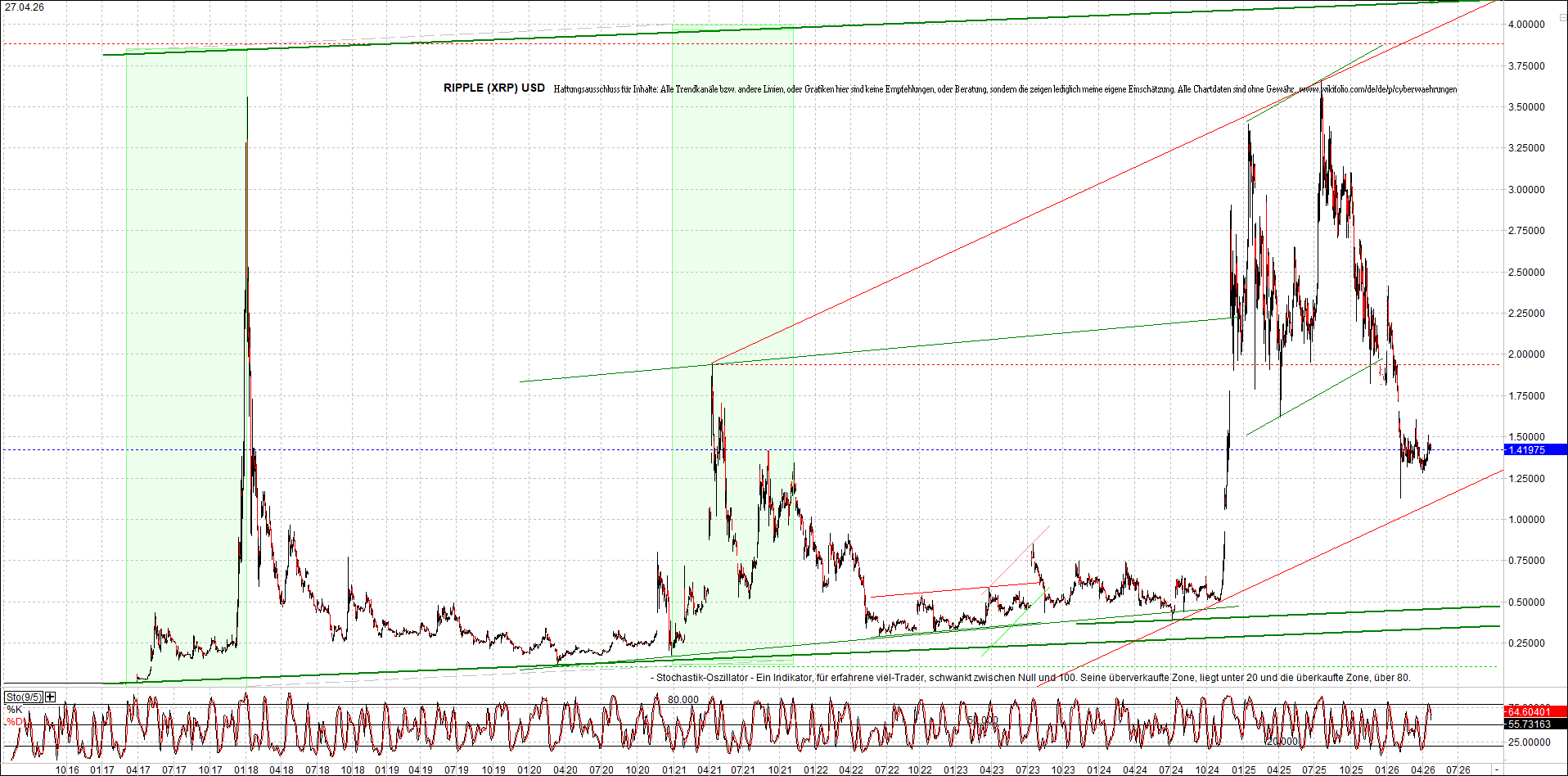 Mehr über die 4 und auch weitere 3 wikifolio-Endlos-Zertifikate gibt es hier. Aber bitte da nicht erschrecken wegen den charts, weil die wikifolios sollten die original-performance so getreu nachbilden wie möglich, aber die charts bei wikifolio zeigen leider nur ein kleines Zeitfenster. Deswegen habe ich hier die entsprechenden langfristigen original-performance-charts reingestellt. Die kann ich auch gerne ab und zu aktualisieren. Die Trendkanäle bzw. andere Linien, oder Grafiken in diesem thread sind aber keine Empfehlungen, oder Beratung, sondern sie zeigen ausschließlich meine eigene Meinung.