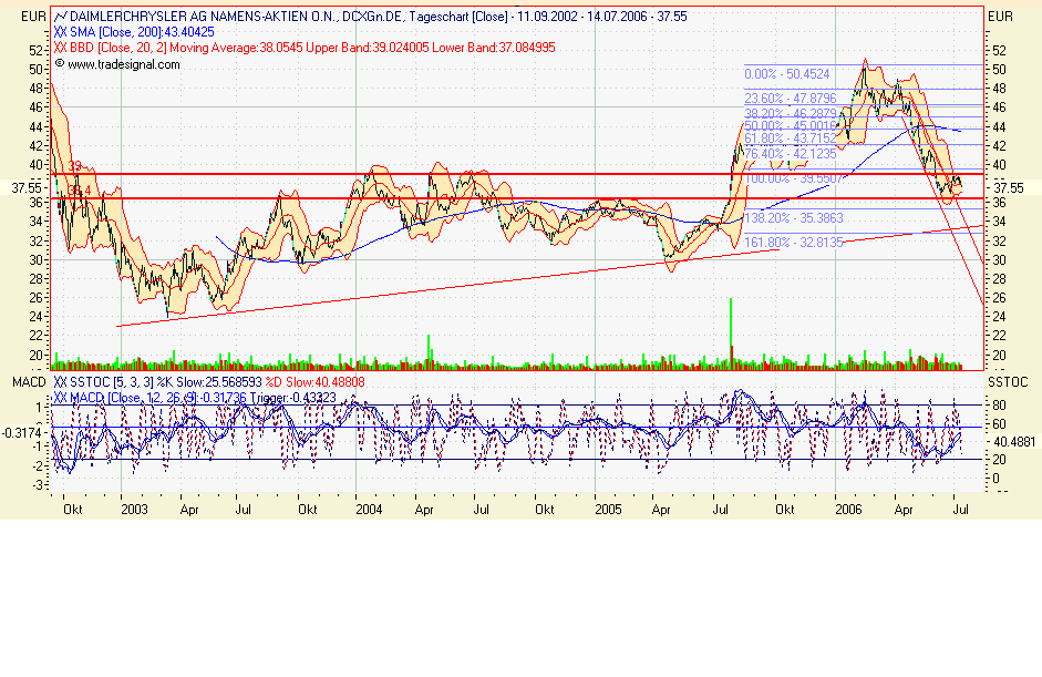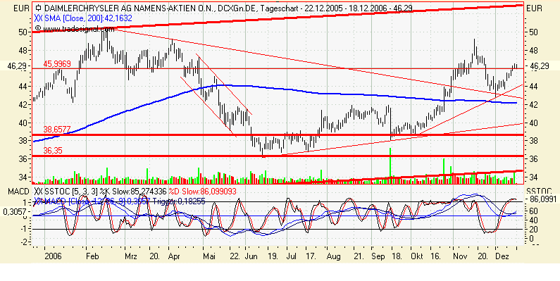 Charttechnischer Ausblick: So lange die DAIMLERCHRYSLER Aktie per Tagesschlusskurs über 44,70-45,00 Euro notiert, ist die übergeordnete Aufwärtsbewegung vollkommen intakt. Die Ziele liegen bei 50,45 und später bei 58,22 Euro. Fällt die Aktie jedoch unter 44,70 Euro per Tagesschlusskurs zurück, wären Abgaben bis 42,66 Euro zu erwarten.