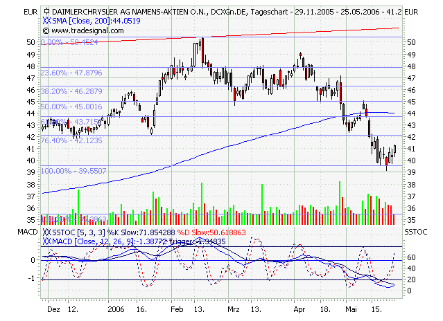 Rückblick: Die DAIMLERCHRYLSER Aktie brach am 01.11.2006 über den Widerstandsbereich 44,70-45,00 Euro aus und zog danach auf 49,25 Euro an. Von diesem Hoch aus fällt die Aktie seit 16.11.2006 zurück. Im heutigen Handel setzte die Aktie bereits auf dem überwundenen Bereich 44,70-45,00 Euro auf. Von dort aus erholt sich die Aktie im Tagesverlauf bereits, was durch die Lunte der heutigen Kerze dokumentiert wird. Sie deutet also Kaufneigung in diesem Bereich an.