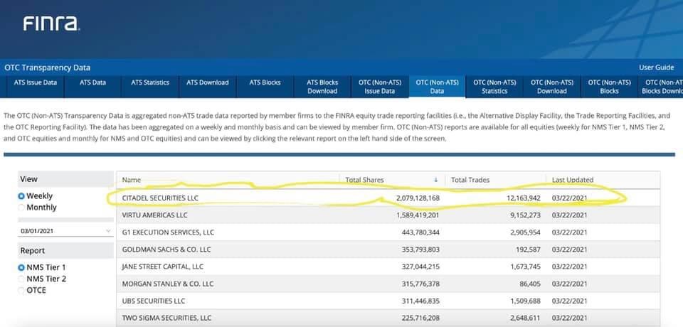 laut dem Screenshot hat Citadel, nach meinem Verständnis, im Zeitraum Januar bis 01.03.21 im Dark Pool etwas mehr als 1 Milliarde AMC Aktien bei 3,6 Mio Trades bewegt. Das können z.Bsp. Käufe, Verkäufe, gedeckte und ungedeckte Leerverkäufe gewesen sein.