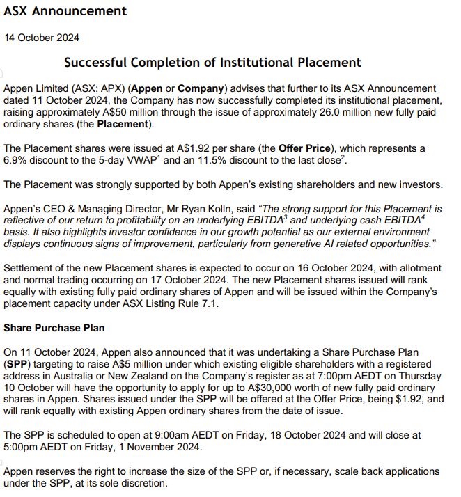 Eigenkapitalbeschaffung Appen führt eine vollständig garantierte institutionelle Platzierung durch, um etwa 50 Millionen australische Dollar aufzubringen. Im Rahmen der Platzierung werden etwa 26,0 Millionen neue Aktien ausgegeben, was etwa 11,6 % der bestehenden ausgegebenen Aktien entspricht. Die Platzierung ist vollständig zum Angebotspreis von 1,92 AUD pro neuer Aktie gezeichnet, was einem Abschlag von 6,9 % auf den 5-Tages-VWAP entspricht.7und einem Abschlag von 11,5 % auf den letzten Schlusskurs8. Eine Zusammenfassung der Bedingungen des Zeichnungsvertrags für die Platzierung finden Sie in Anhang 1. Die Abwicklung der Platzierung wird voraussichtlich am Mittwoch, den 16. Oktober 2024 erfolgen, wobei die Zuteilung und der normale Handel am Donnerstag, den 17. Oktober 2024 erfolgen. Die neuen Aktien sind den bestehenden, voll eingezahlten Stammaktien von Appen gleichgestellt und werden im Rahmen der Platzierungskapazität des Unternehmens gemäß ASX-Listing-Regel 7.1 ausgegeben. Appen wird außerdem einen nicht garantierten Aktienkaufplan aufsetzen, dessen Ziel darin besteht, 5 Millionen australische Dollar aufzubringen. Berechtigte Aktionäre mit einer eingetragenen Adresse in Australien oder Neuseeland im Aktienregister des Unternehmens haben am Donnerstag, den 10. Oktober 2024, um 19:00 Uhr (Sydney-Zeit) die Möglichkeit, im Rahmen des SPP neue Aktien im Wert von bis zu 30.000 A$ zu beantragen. Im Rahmen des SPP ausgegebene Aktien werden zum Angebotspreis von 1,92 australischen Dollar angeboten und sind ab dem Ausgabedatum den bestehenden Stammaktien von Appen gleichgestellt. Es wird erwartet, dass die SPP-Angebotsfrist am Freitag, den 18. Oktober 2024 beginnt und am Freitag, den 1. November 2024 um 17:00 Uhr (Sydney-Zeit) endet. Appen behält sich das Recht vor, nach eigenem Ermessen den Umfang des SPP zu erhöhen oder die Anzahl der Anträge im Rahmen des SPP bei Bedarf zu reduzieren. |