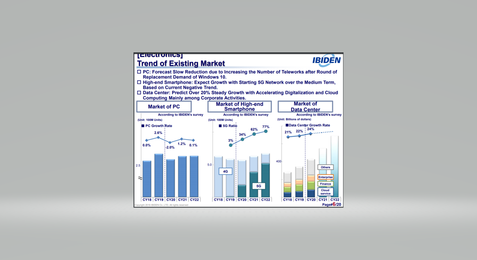 Diese beiden übergeordneten Trends (Tausch in 5G-fähige Handys und Ausbau der Server-Kapazitäten), die sich in den nächsten Jahren, ergeben werden für das Geschäft von AT&S ein absoluter Treiber werden. Übrigens finde finde ich hier die Grafiken von der Ibiden-Präsentation besser.