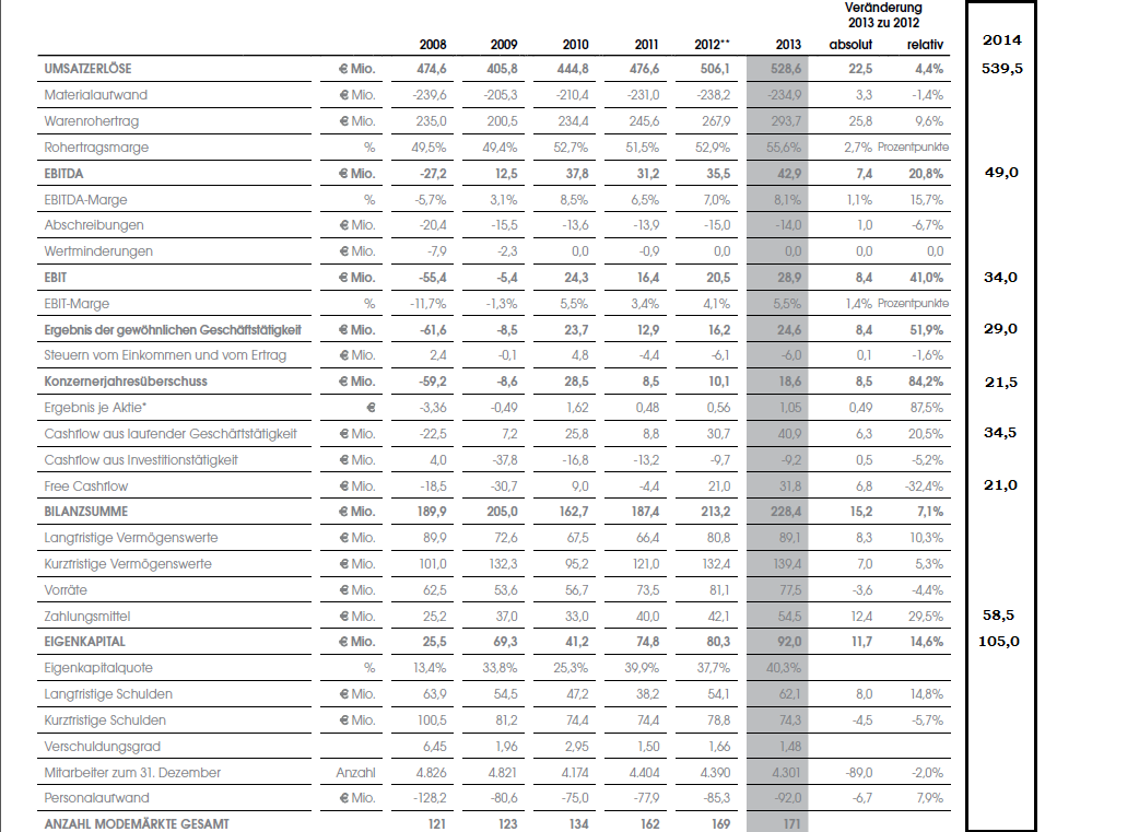 §9 Monate 2014 9 Monate 2013 (angepasst*) Veränd. (in %) Umsatzerlöse 377,9 367,0 3,0 EBITDA 18,3 11,6 57,8 EBITDA-Marge (in %) 4,8 3,2 1,6%P EBIT 6,8 1,2 466,7 EBIT-Marge (in %) 1,8 0,3 1,5%P Konzernergebnis 1,4 -1,9 173,7 Ergebnis je Aktie 0,08 -0,11 172,7 30.09.2014 31.12.2013 Veränd. (in%) Bilanzsumme 247,0 228,4 8,1 Eigenkapital 94,0 92,0 2,2 Eigenkapitalquote (in %) 38,1 40,3 -2,2%P Zahlungsmittel und Zahlungsmitteläquivalente 46,7 54,5 -14,3 30.09.2014 30.09.2013 Veränd. (in %) Beschäftigte 4.136 4.222 -2,1 Märkte gesamt 168 168 0,0