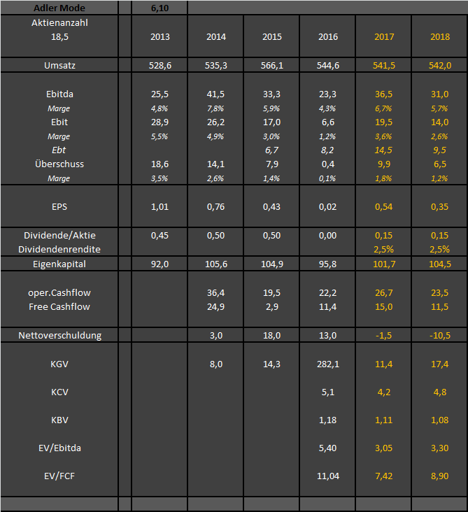 An Tom Tailor u.a. sieht man aber, dass die Kurse viel zu stark gefallen waren. Adler hat sich dagegen noch eher langsam erholt, obwohl man weit günstiger als die Branche bewertet ist. Man unterstellt wohl, dass Adler durch die einzigartige Kundengruppe (vor allem Ältere) den Wandel zum Onlinegeschäft nicht packt. Aus meiner Sicht ist das zu kurz gedacht. Erstens könnte es ja sein, dass die Älteren das gar nicht wollen. Viele 45-65 jährige (wenn sie nicht gerade schon gebrechlich sind) kaufen halt lieber direkt im Geschäft. Hinzu kommt, dass auch Firmen wie Adler nicht schlafen und mittlerweile Onlineangebote haben, teilweise flexibel gestaltet.