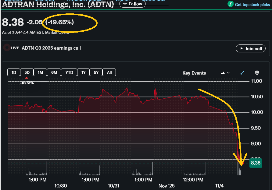 Tue, November 4, 2025  -ADTRAN Holdings: Q3 Earnings Snapshot - https://finance.yahoo.com/news/...q3-earnings-snapshot-100640089.html ".. ADTRAN Holdings, Inc. (ADTN) on Monday reported a loss of $10.3 million in its third quarter. On a per-share basis, the Huntsville, Alabama-based company said it had a loss of 12 cents.