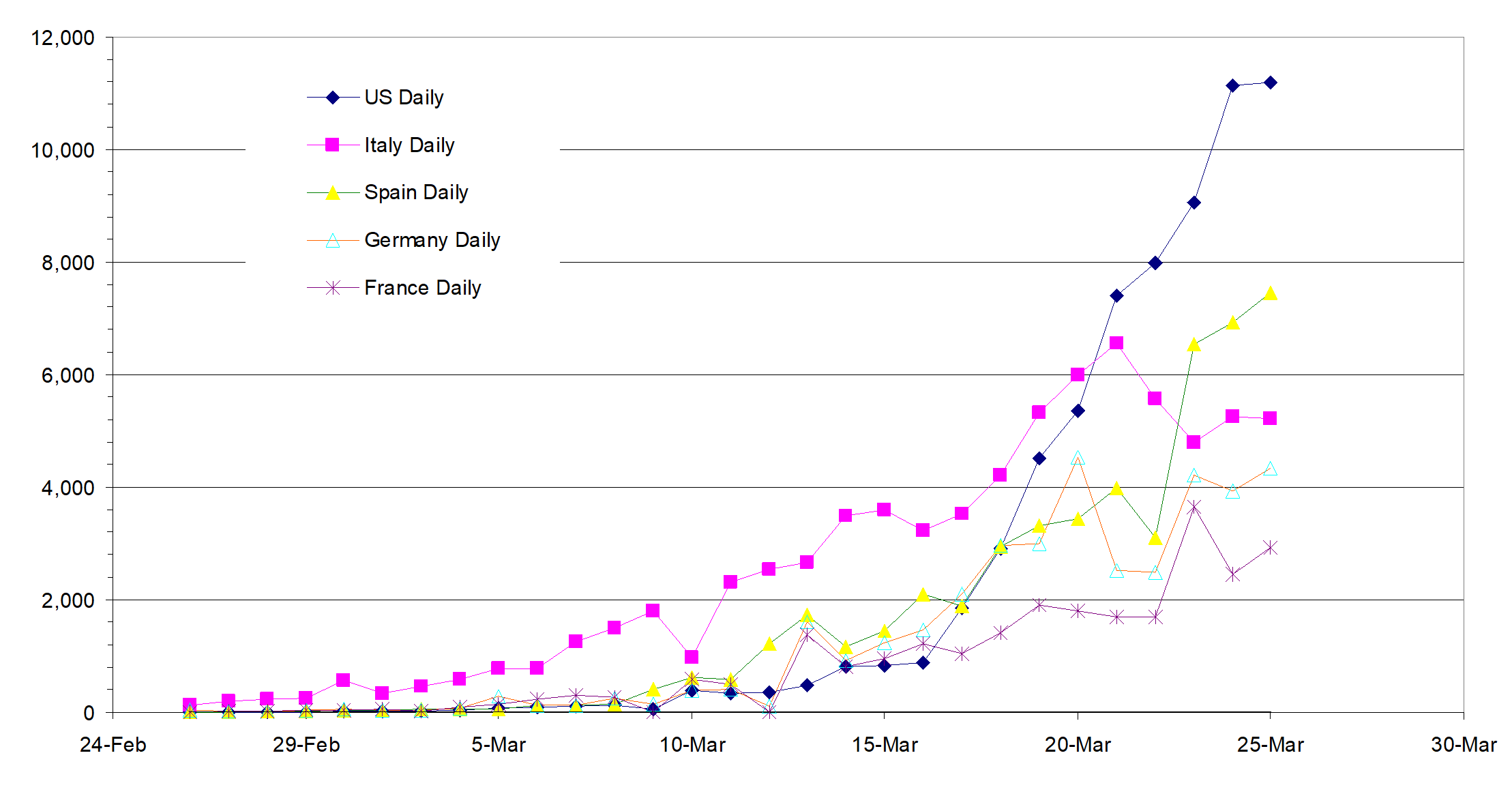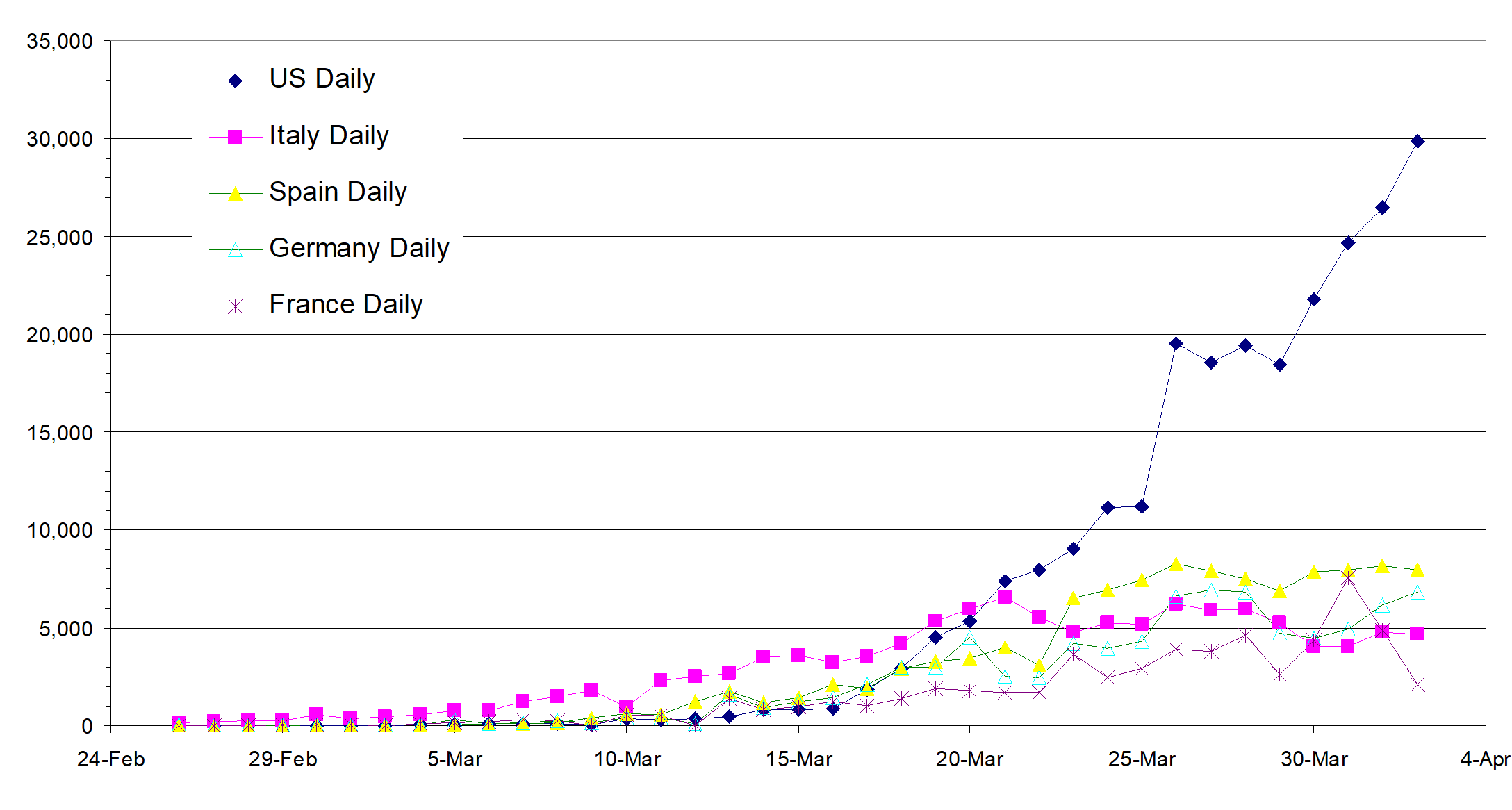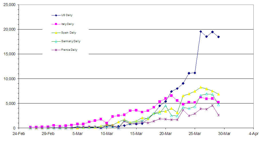 US rising while the four European countries seem to be under control.