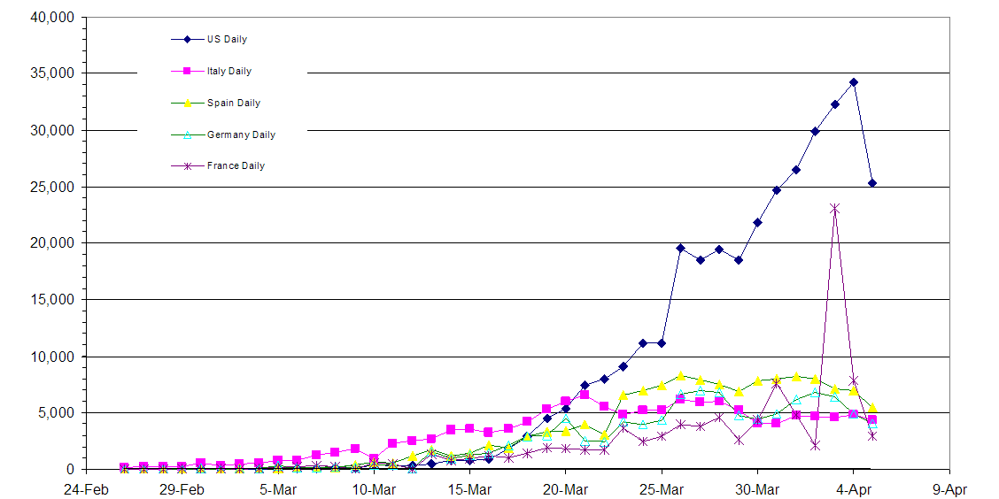 Large drop in US yesterday. All four European countries still improving slowly.  The large jump in France two days ago but came right back down could be due to data collection error.