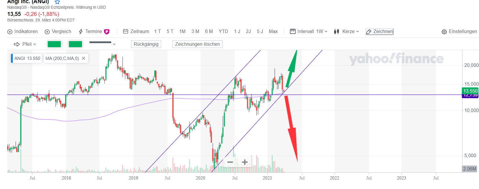 EMA 200 horizontale Unterstützung und Unterkante Trendkanal, wer will sieht auch eine iSKS...Fallen wir nachhaltig unter die 13$ haben wir ein riesiges Doppeltop mit Ziel 4$ vom Märztief 2020. Also jetzt ggf. nochmal die Werbetrommel rühren, damit wir das Negativszenario abwenden können ;)