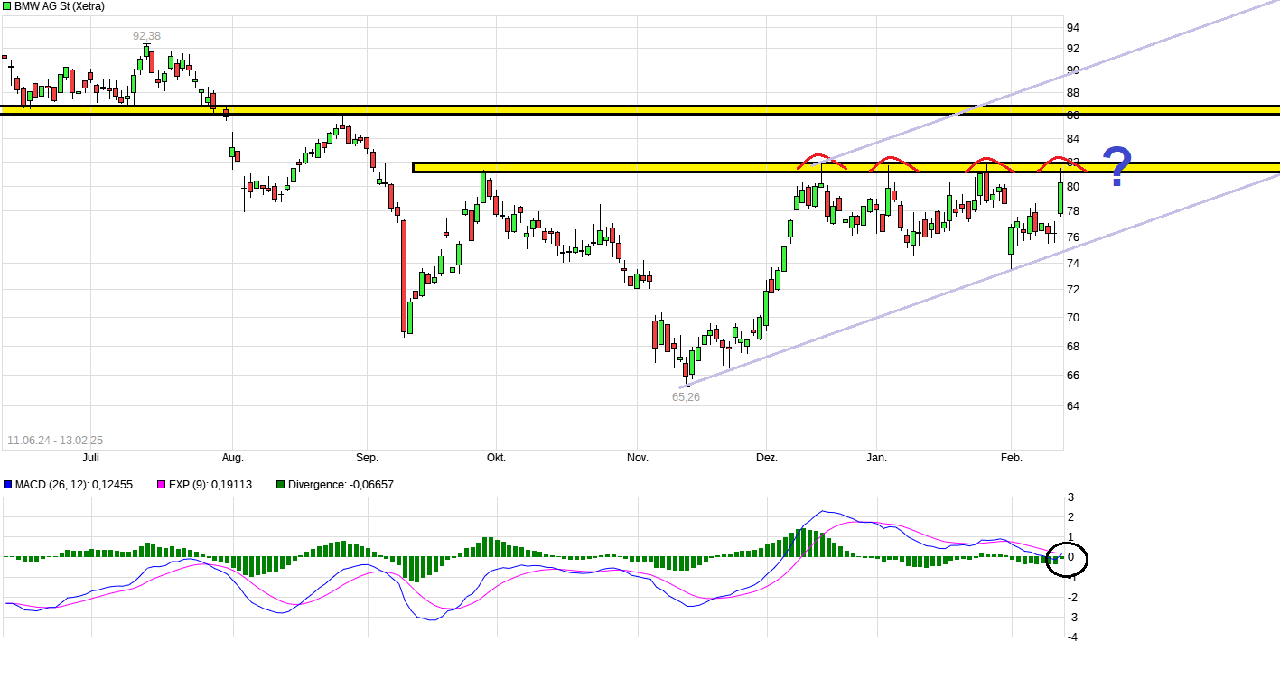 Der Gesamtmarkt ist weiter in der Trump 2.0. Euphorie, DAX rennt daher seit Monaten von einem Allzeithoch zum nächsten Allzeithoch. Die Autowerte kamen allerdings in der letzten Zeit nicht wirklich hinterher, da man Zollbefürchtungen hat, die aber vielleicht zu übertrieben sein könnten. Entsprechend wäre eine Abkehr von dieser übertriebene Angst ( siehe die Meldung unten) eine Gelegenheit endlich die Widerstandszone doch zu überwinden, was vielleicht dann auch noch einige technisch induzierte Anschlußkäufe generieren würde in Richtung 86/87€ . Aber noch ungelegtes Ei. Trotzdem werde ich mich mal spekulativ positionieren, jedoch mit recht enger Absicherung ;)