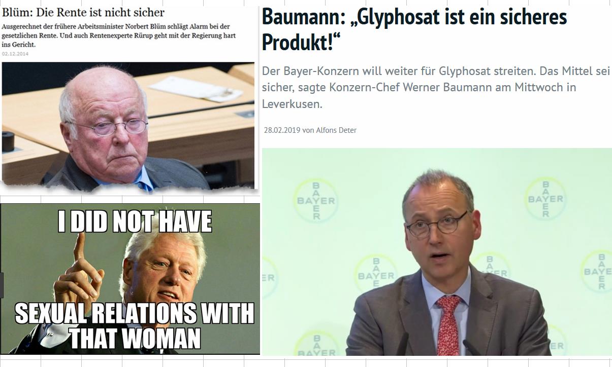 ich stelle Baumann hier neben einen Lügner (Clinton), dem ich übrigens seine Lüge nicht übel nachtrage, und neben Norbert Blüm, der nicht lügt, aber dessen Aussage kritisch hinterfragt werden muss. Ja, die Rente ist, sicher. Es ist aber nicht sicher, ab wann (Renteneintrittsalter) wir heute noch Arbeitenden beziehen werden und in welcher Höhe - deshalb ja auch private Altersvorsorge. Sicher in Bezug auf Glyphosat ist, dass es den Tod für damit behandelte Pflanzen bringt - Unkraut-EX. Der Link zu der Doku auf Youtube führt zu einer sehr kritischen Studie. Natürlich kann ich deren Wahrheitsgehalt nicht prüfen, aber zumindest sind negative Wirkungen von Glyphosat glaubhaft dargelegt. Dass hier Kläger in den USA Recht bekommen haben, beweist zwar nicht, dass Glyphosat ursächlich verantwortlich für Krebs ist, legt dies aber zumindest nahe. Zu glauben, dass ein Mittel gesundheitlich unbedenklich sein soll, das Pflanzen - und hierbei auch widerstandsfähige Kräuter und Gräser - sicher abtötet, halte ich für eine gewagte These. Und die Höhe der Rechtsrisiken, die man sich mit Monsanto eingekauft hat, übersteigt möglicherweise das, was Bayer in der Lage ist, wirtschaftlich zu verkraften. Deshalb würde ich persönlich Bayer zurzeit nicht mit der Pinzette anfassen...