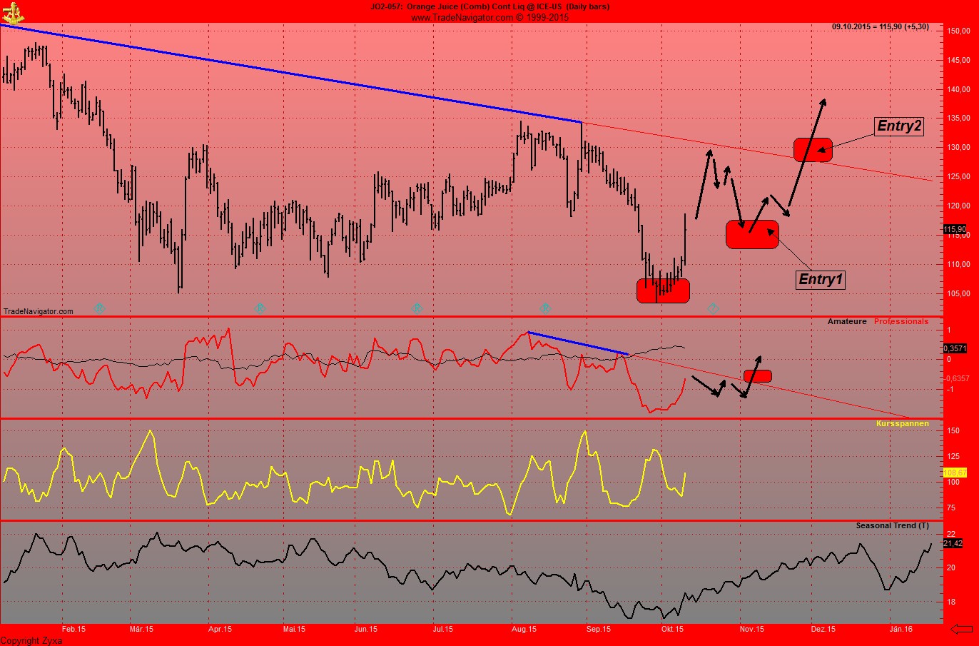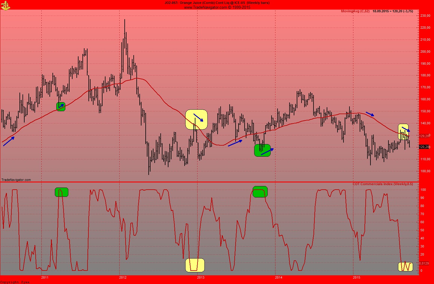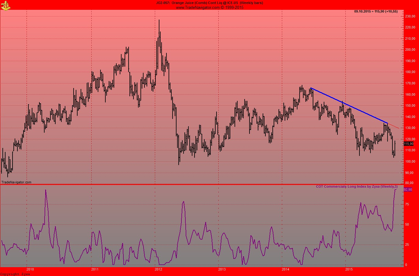 Meine Trades zeigen, wie man auch bei Orangensaft sieht, haette man eigentlich jedes mal, wenn der Commindex auf 100% long steht, kaufen koennen. Mit Ausnahme ende 2014 vielleicht, da waehre man wohl mehrere Male frustriert ausgestopt worden.