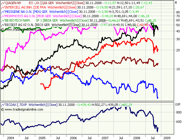 Wenn man sich den Biotechnology-Index der Amis anschaut, ist die schöne Erholung der letzten zwei Jahre aber sowas von völlig vorbei gegangen! Klar, Ausnahmen gibt es... mit GPC oder Morphosys. Wird der Gesamtmarkt weiter so abwärts gehen wie bisher? Lohnt z.B. gerade jetzt ein Einstieg in einen stark gebeutelten Biotech-Fonds? Fragen über Fragen...