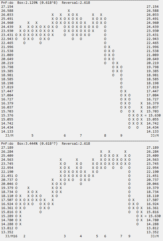 PnF:do Box:2.129% (0.618^8) Reversal:2.618 27.154 27.154 26.588 X 26.588 26.033 X X X O X X X 26.033 25.491 X O X O X O X O X O X O 25.491 24.960 X X X O X O X O X O X X O X O 24.960 24.439 X X O X O X O X O O X O X O X O X O O 24.439 23.930 X O X O X O X O X O X O X O X O X O 23.930 23.431 O X O X O X O X O X O O X O X O O 23.431 22.943 O O X O O X O O O O 22.943 22.465 O O O 22.465 21.996 O X 21.996 21.538 O X O 21.538 21.089 O X O 21.089 20.649 O X O 20.649 20.219 O O X 20.219 19.798 O X O 19.798 19.385 O X O 19.385 18.981 O O 18.981 18.585 O 18.585 18.198 O 18.198 17.819 O 17.819 17.447 O X 17.447 17.084 O X O 17.084 16.727 O X O 16.727 16.379 O X O X 16.379 16.037 O X O X 16.037 15.703 O O X X 15.703 15.376 O X O X « 15.63 15.055 O X O X 15.055 14.742 O X O X 14.742 14.434 O O 14.434 14.133 14.133 JJ/M 5 6 7 8 9 JJ/M __________________________________________________ PnF:do Box:3.444% (0.618^7) Reversal:2.618 27.189 27.189 26.284 X X X 26.284 25.409 X O X O X X O 25.409 24.563 X X X X O X O X O X O 24.563 23.745 X O X O X O X O X O X O X O 23.745 22.954 X O X X O X O X O O O O 22.954 22.190 X O X O X O X X O O 22.190 21.451 O X O X O X O X O X O 21.451 20.737 O X X O X O O X O O 20.737 20.046 O X O X O O O 20.046 19.379 O X X O X O 19.379 18.734 O X O X X O X O 18.734 18.110 O X X O X O X O O 18.110 17.507 O X O X O X O X X O X 17.507 16.924 O X O X O O X O X O X O 16.924 16.361 O X O O X O O X O X 16.361 15.816 O X O O O X 15.816 15.289 O X O X « 15.63 14.780 O X O X 14.780 14.288 O X O 14.288 13.812 O 13.812 13.352 13.352 JJ/M16 2 3 4 5 6 7 9 JJ/M __________________________________________________ PnF:do Box:5.573% (0.618^6) Reversal:2.618 39.450 39.450 37.368 X X X 37.368 35.395 X O X O X O X X 35.395 33.527 X O X O X O X O X O 33.527 31.757 X O O X O X O X O 31.757 30.081 O X O X O X O 30.081 28.493 O X O O X O 28.493 26.989 O O X O 26.989 25.564 O O X 25.564 24.215 O X X X X O 24.215 22.936 O X X O X X O X O X O 22.936 21.726 O X O X O X O X O X O X O 21.726 20.579 O X O X O X O X O O X O 20.579 19.493 O O O X O X X O O 19.493 18.464 O X O X O X O 18.464 17.489 O X O X O X O 17.489 16.566 O X O X O X O 16.566 15.691 O O X O O 15.691 14.863 O X O « 15.630 14.078 O O 14.078 13.335 13.335 JJ/M B C 15 4 8 A 16 2 3 4 JJ/M |