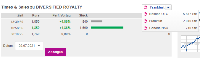 Glück gehabt: Inzwischen stehe ich mit Diversified Royalty bereits fast 5% im Plus. Nachdem die Aktie seit dem 14.7.2021 ex Dividende notiert und ich erst am 29.7. dort eingestiegen bin, werde ich diesen Monat zwar noch keine Dividende erhalten, aber das war schon mal ein recht positives Starterlebnis.