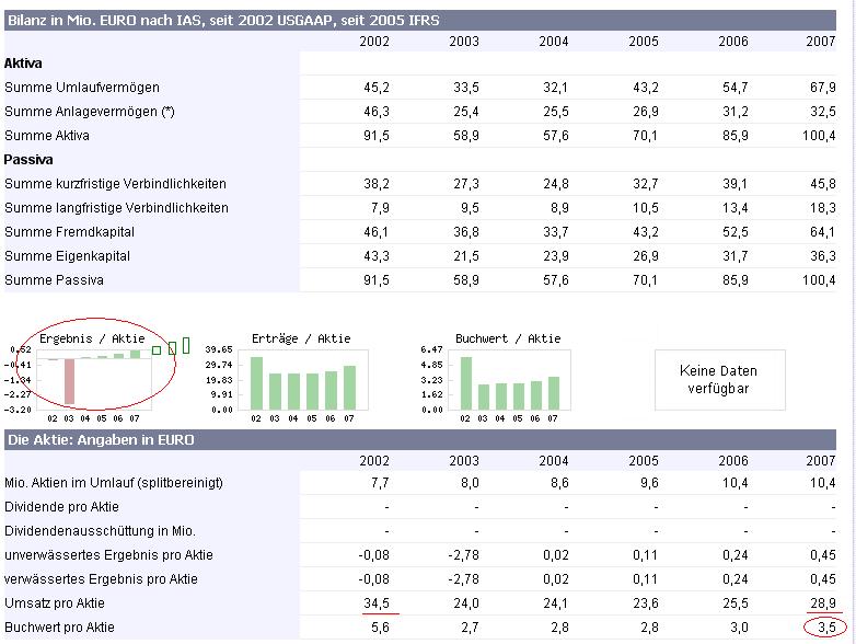 Im Gewinn seien neben Lagerabschreibungen, die das Ergebnis belastet hätten, auch positive Einmaleffekte enthalten. Beispielsweise handle es sich um einen positiven Steuereffekt bedingt durch die Unternehmenssteuerreform und die schnellere Nutzbarkeit vorhandener Verlustvorträge aufgrund positiver Ertragsaussichten. Per saldo seien die positiven Effekte höher als die negativen Einmaleffekte gewesen. Bereinigt um diese, hätte das Unternehmen in 2007 einen Gewinn je Aktie von leicht über 40 Cent eingefahren.
