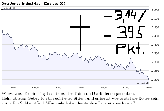 A b e r, heute habe ich zusätzlich erkannt, dass hoch und tief an der Börse relativ ist. Es hängt von der Zeitebene ab. Es gibt 3 Zeitebenen. Die Langfristige Zeitebene von mehreren Jahren, die besonders gut im 10-Jahres-Chart erkennbar ist, die kurz- und mittelfristige Zeitebene von mehreren Wochen bis Monaten, die besonders gut im 1-Jahres-Chart erkennbar ist und die sehr kurzfristige Zeitebene von einem Tag bis wenigen Tagen, die besonders gut im Tageschart erkennbar ist. Wenn ich einen 10-Jahres-Chart anschaue und somit die langfristige Zeitebene betrachte, ist hoch momentan nicht viel höher und tief meist viel tiefer als der aktuelle Kurs. Die Aktie erscheint also hoch und damit teuer. Wenn ich aber den 1-Jahres-Chart anschaue sieht das Bild völlig anders aus. Dann erscheint eine Deutsche Bank Aktie die gerade gewaltig abstürzt nicht mehr als mittelhoch sondern als tief. Bei der Betrachtung der Tops- und Flops Liste der letzten 3 Tage ist mir aufgefallen wie unglaublich diese Aktie abgestraft wird obwohl die Bank eigentlich gut dasteht. Die Tops- und Flops-Liste ist das perfekte Börsenmessgerät und man kann die Emotionen wie Gier und Panik wunderbar erkennen, messen, viele Tage vergleichen und durch Abspeicherung über Jahre konservieren. Konservierte Emotionen. Hoffnung und Verzweiflung für immer auf die Festplatte gebannt. Ich kann in 2 Wochen wenn der Sturm vorüber ist die Deutsche Bank vielleicht für 60 € kaufen. Das wäre auf der kurz- und mittelfristigen Zeitebene von Wochen bis wenigen Monaten eine großartige Chance tief einzusteigen. Dies habe ich vor zwei Monaten bei Continental nicht erkannt. Ich schaute auf den 10-Jahres-Chart und sah eine Aktie die immer noch hoch stand und die ich somit als teuer ansah. Das war sie auch langfristig gesehen. Denn wenn die US-Rezession erst Europa erreicht, wird sie auf mehrere Jahre gesehen gewaltig nach unten rauschen. Auf der kurz- und mittelfristigen Zeitebene von wenigen Wochen aber war diese Aktie absolut tief und günstig. Merke: Eine Aktie kann also zur gleichen Zeit günstig und teuer sein, je nachdem welche Zeitebene man betrachtet. Man hätte mit mittlerem Einsatz von ca. 1000 Euro entsprechend dem kurz- und mittelfristigen Zeithorizont von nur wenigen Wochen long gehen sollen. Wichtig ist also alle 3 Zeitebenen abzudecken. Man könnte nach dieser Strategie sogar zeitgleich auf eine Aktie langfristig short und kurzfristig long gehen und hätte so sogar noch eine zusätzliche Sicherheit durch die Hedgekonstruktion. Alle 3 Zeitebenen sollte man abdecken, damit man in jeder Marktsituation wenigstens innerhalb einer Zeitebene Gewinne machen kann.. Und innerhalb jeder der 3 Zeitebenen muss man isoliert betrachten was hoch und was tief ist und entsprechend dem ewigen und höchsten Grundsatz kaufe tief verkaufe hoch und verkaufe hoch leer und tief zurück handeln. Am besten ist es erst einzusteigen, wenn das Börsenmessgerät Tops- und Flops-Liste anzeigt, dass eine Aktie nach starken Kursverlusten massiv ansteigt. So erreicht man eine enorm erhöhte Gewinnwahrscheinlichkeit. A b e r: Es gibt neben den 3 Zeitebenen noch eine 4. Ebene. Das ist die Dummenebene. Es ist die Ebene auf der sich eine Aktie einfach gerade befindet. Egal ob hoch oder tief, die Aktie steigt einfach massiv wie z.B. K+S. Wer die Frage, ob diese Aktie hoch oder tief steht beim Durchbruch der 200 € ausblendete und sich nur gemäß dem Börsenmessgerät Tops- und Flops Liste auf den Top-Star K+S stürzte konnte in wenigen Wochen enorme Gewinne machen. Diese Dummenebene ist neben den 3 Zeitebenen eine weitere sehr wichtige Ebene. Einfach den Top-Gewinnern folgen ohne nachzudenken sollte als weitere ergänzende Strategie neben der Hauptstrategie des 3 Zeit-Ebenen-Tradings genutzt werden, denn die dümmsten Bauern haben bekanntlich die größten Kartoffeln. Ich werde das aber erst machen, wenn ich mit der konservativen antizyklischen 3 Zeit-Ebenen-Strategie genug Geld gewonnen habe. Dann werde ich mich auch auf die Dummenebene wagen und blind prozyklisch den Top-Gewinneraktien bzw. Top-Verliereraktien folgen egal wo sie stehen. Dazu gehört sehr viel Mut oder sehr viel Dummheit (deshalb Dummenebene) aber es funktioniert erstaunlich oft, weil die Herdenmentalität des Menschen sehr stark ist. Die Dummenebene ist aber auch aus einem anderen Grund sehr wichtig. Die Börse ist ein launisches Weib und schenkt einem nicht jeden Tag die Gunst der optimalen antizyklischen Einstiegspunkte und da bleibt dann eben nur die Dummenebene.
