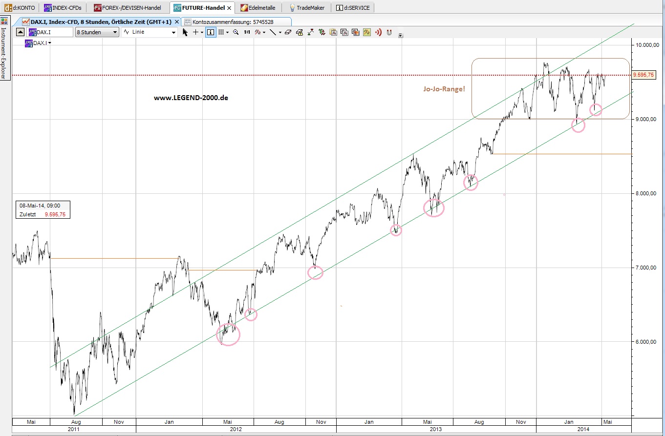 Wer über 9535 ein SHORT-Netz aufgebaut hatte min. 5 Positionen je 1/2 CFD der konnte mehrere Punkte im DAX mit SHORT und LONG mitnehmen.