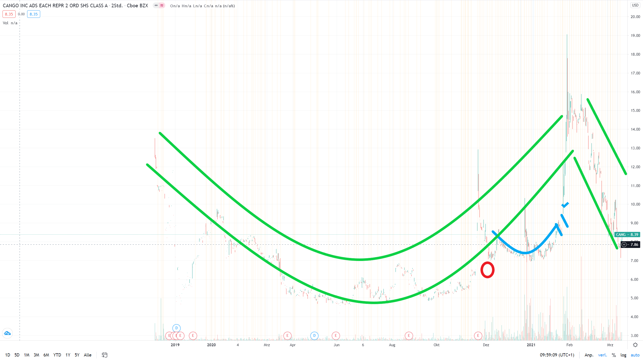 Der Chart bildet regelmäßig Cups and handles. Die Henkel brechen oder auch nicht, sie knicken aber immer wieder nach unten, das ist schonmal die Eigentümlichkeit, die wir bei Cang feststellen können. Was sich noch nicht eindeutig auswächst ist, wie der Kurs seine Tassen bastelt, es gibt keine quotentuale Abhängigkeit der Höhe des rechten zum linken Rand.